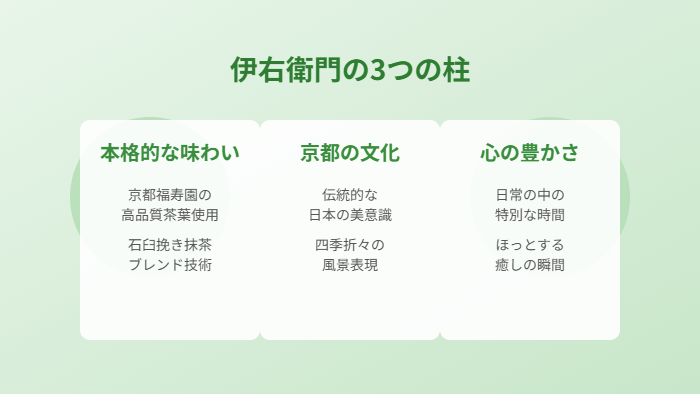 このような激戦区において、伊右衛門は「本物志向」「文化的価値」「情緒的体験」という差別化ポイントを明確にしています。